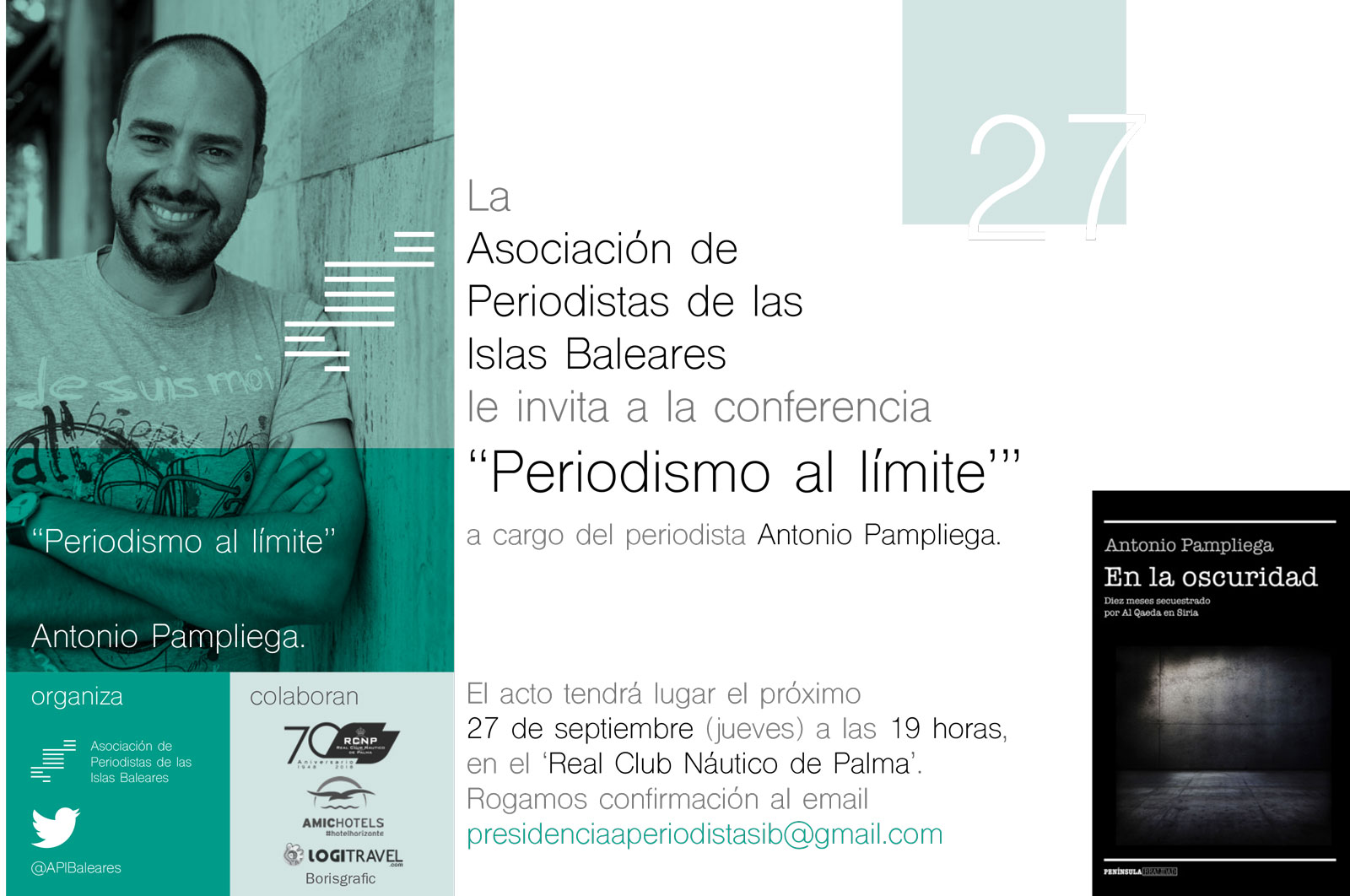 La APIB ha organizado una charla con el periodista Antonio Pampliega, freelance experto en zonas de conflicto, secuestrado por Al Qaeda en Siria durante 10 meses (de julio de 2015 a mayo de 2016). El encuentro tendrá lugar el jueves 27 de septiembre, a las 19 horas, en el Real Club Náutico de Palma. Pampliega impartirá una ponencia titulada ‘Periodismo al límite’ y contará su experiencia profesional en países como Irak, Líbano, Pakistán, Afganistán, Haití, Sudán del Sur o Siria. La asistencia es libre y gratuita, mediante confirmación al correo presidenciaaperiodistasib@gmail.com.