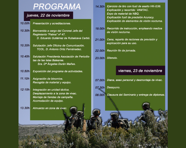 Ejército periodistas baleares 2018 Previous Publicado 7 noviembre, 2018 en 733 × 583 en APIB colabora con el Ejército en una jornada de 24 horas de práctica militar para periodistas con el batallón ‘Filipinas’