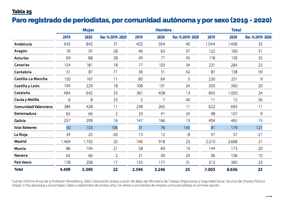 Baleares cierra 2020 con 179 periodistas en paro, un 121% más que hace un año. Según el Servicio de Empleo Público Estatal (SEPE), la pandemia ha duplicado el número de parados en las Islas, que se convierten en la comunidad donde más crece con diferencia. Cambia así drásticamente la tendencia de bajada del paro que venía produciéndose desde 2014. El año pasado había 81 periodistas en paro. En comparación, la media nacional registra una subida del 23%. El dato aparece publicado el Informe de la Profesión Periodística 2020 que realiza cada año la Asociación de la Prensa de Madrid (APM).