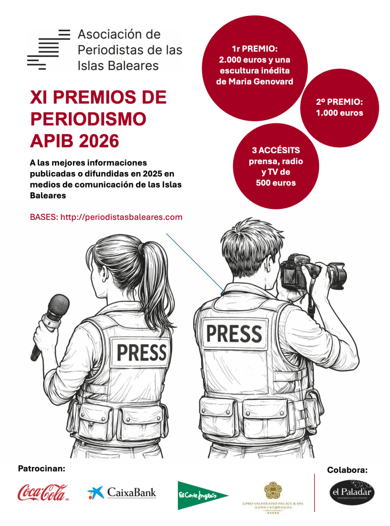 La Asociación de Periodistas de las Islas Baleares (APIB), integrada en la Federación de Asociaciones de la Prensa Española (FAPE), convoca los XI Premios de Periodismo APIB para reconocer los mejores trabajos periodísticos publicados o difundidos en 2025. Los galardones se reparten en un primer premio (categoría absoluta), de 2.000 euros, además de una escultura inédita de la artista Maria Genovard; un segundo premio (también categoría absoluta), de 1.000 euros, y tres accésit de 500 euros para prensa, radio y televisión.