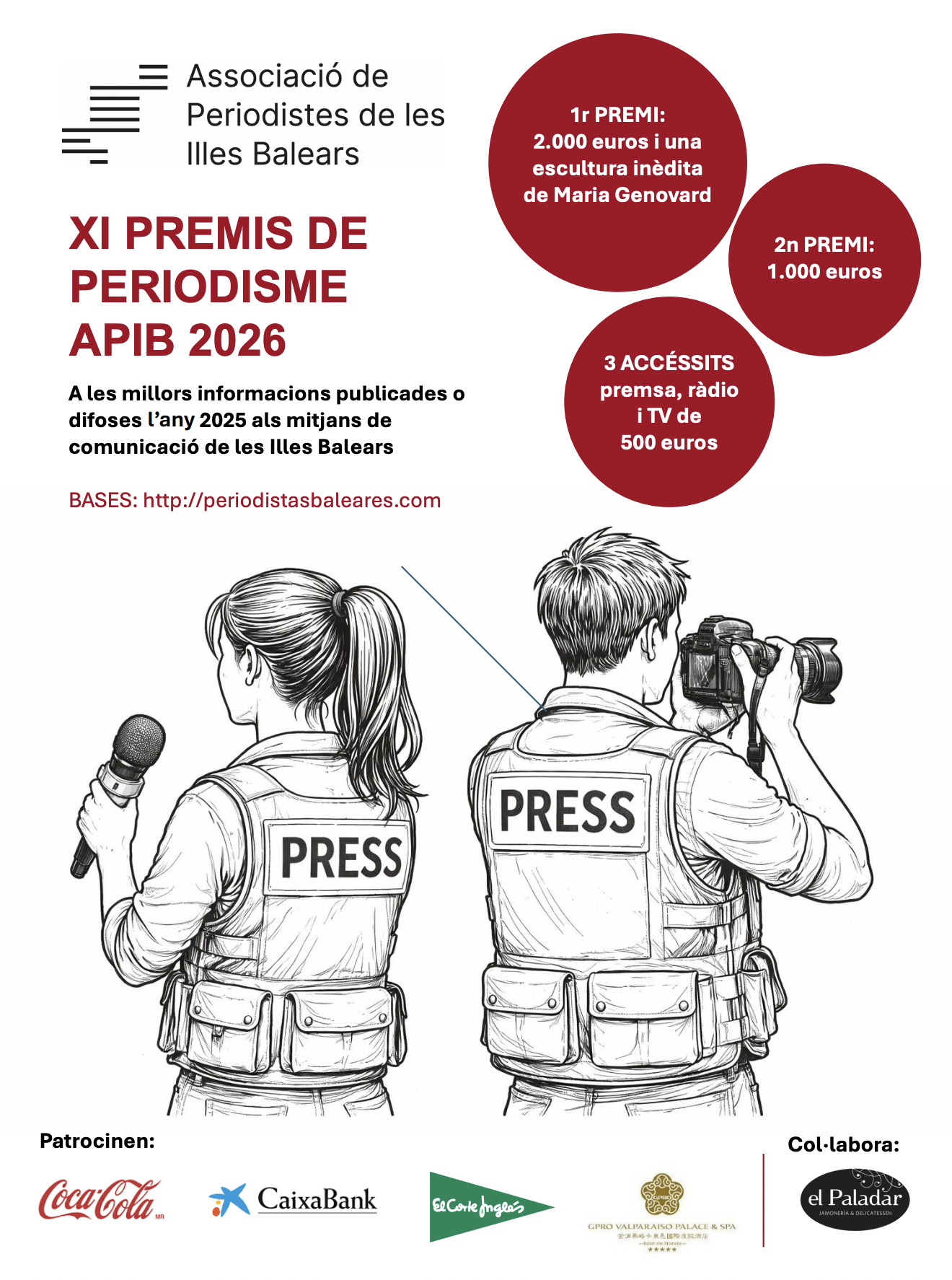 La Asociación de Periodistas de las Islas Baleares (APIB), integrada en la Federación de Asociaciones de la Prensa Española (FAPE), convoca los XI Premios de Periodismo APIB para reconocer los mejores trabajos periodísticos publicados o difundidos en 2025. Los galardones se reparten en un primer premio (categoría absoluta), de 2.000 euros, además de una escultura inédita de la artista Maria Genovard; un segundo premio (también categoría absoluta), de 1.000 euros, y tres accésit de 500 euros para prensa, radio y televisión.