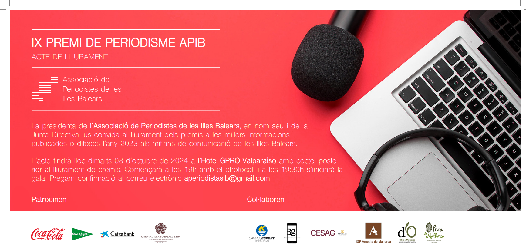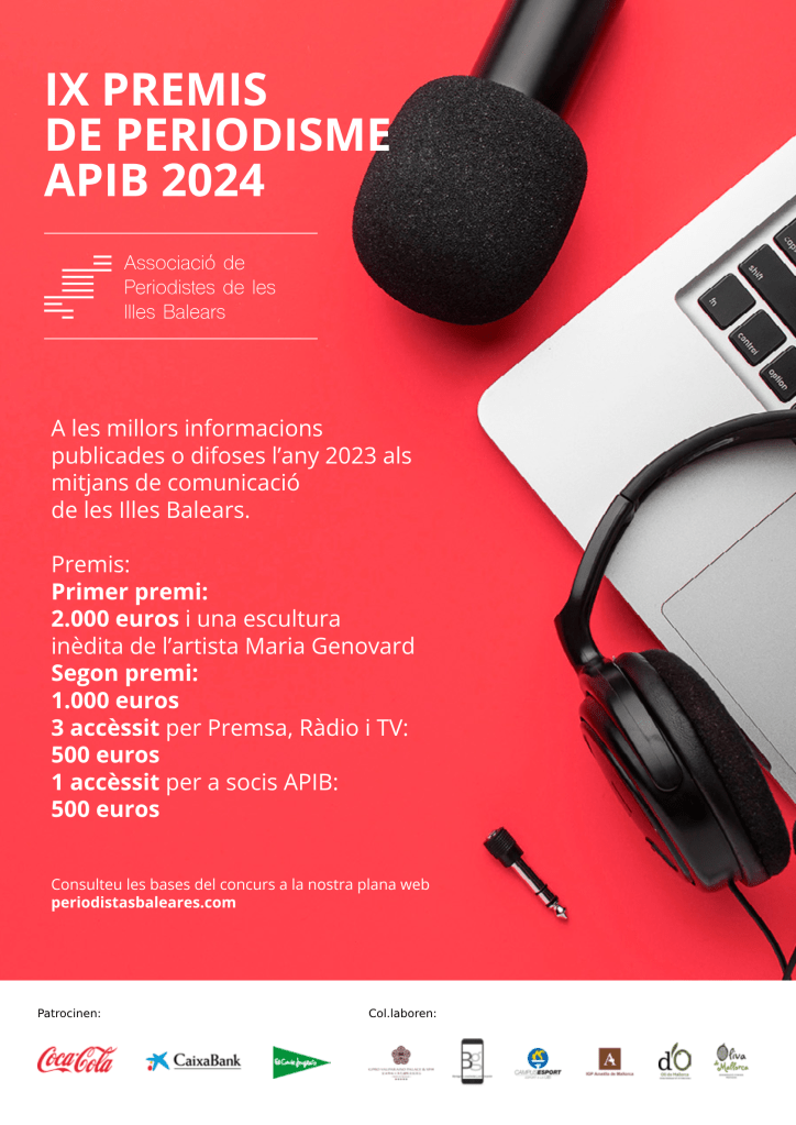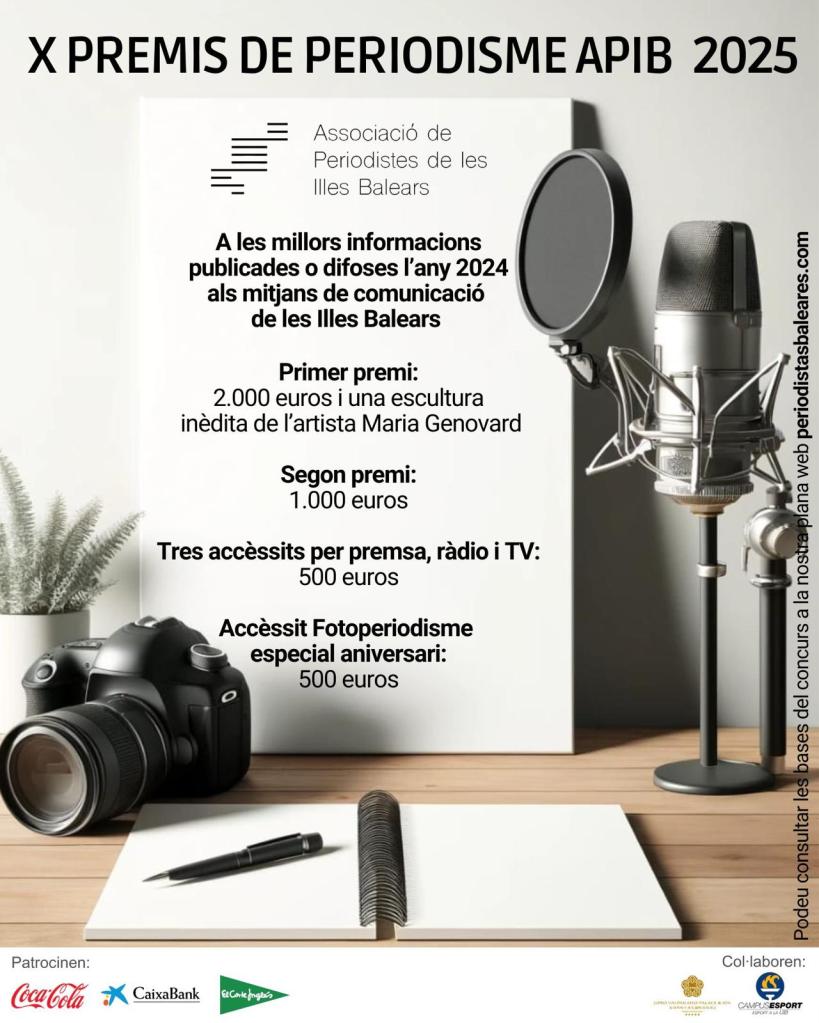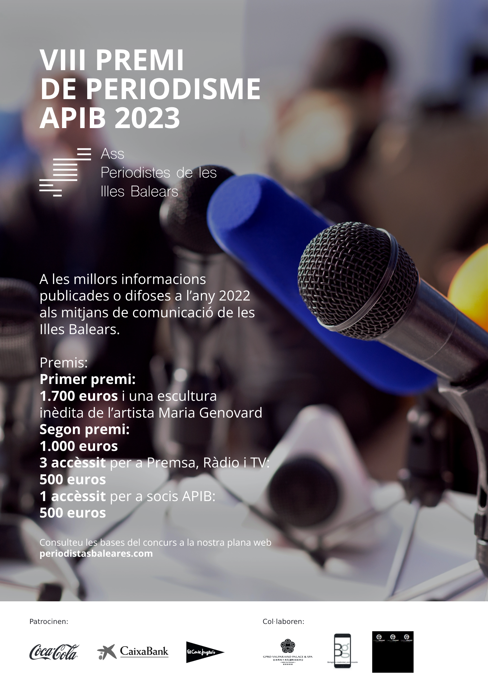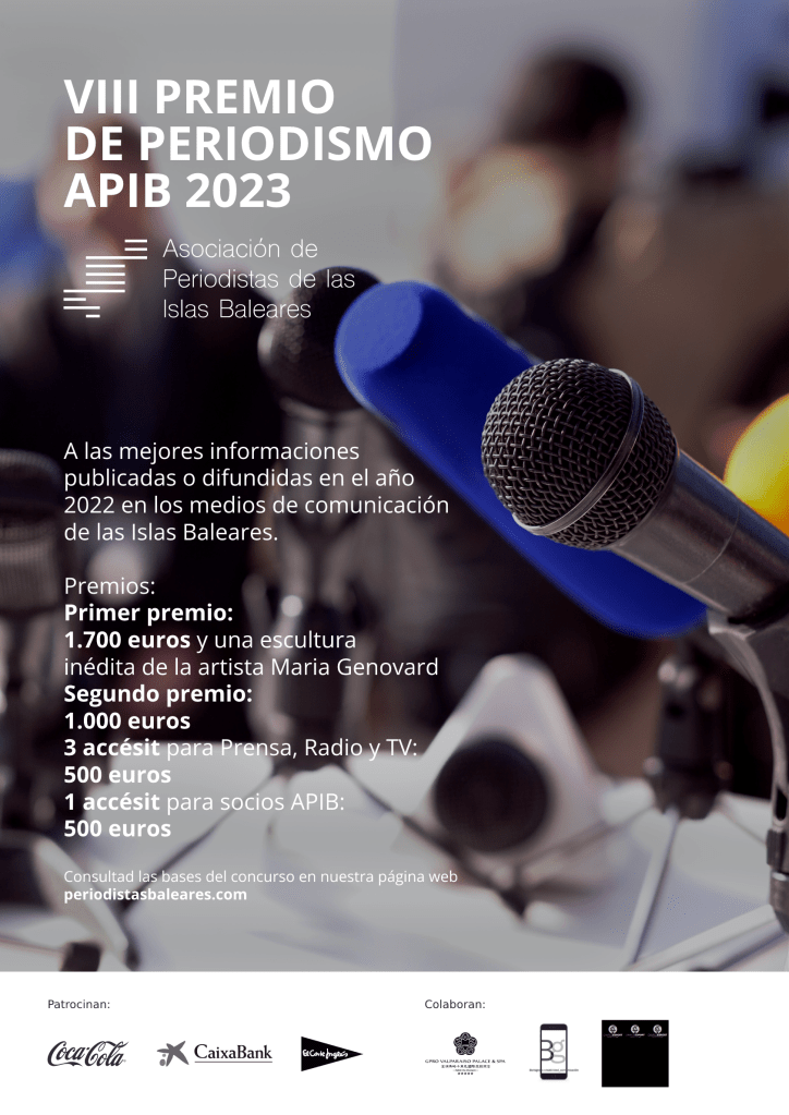 Los galardones se reparten en un primer premio (categoría absoluta), dotado con 2.000 euros y una escultura inédita de la artista Maria Genovard; un segundo premio (también categoría absoluta), dotado con 1.000 euros; tres accésit de 500 euros para prensa, radio y televisión, y una categoría especial para fotoperiodismo, también de 500 euros. Se incluye además el coste de asociación a APIB de los ganadores que lo deseen. Patrocinan el certamen Coca Cola, CaixaBank, El Corte Inglés y CaixaBank, con GPRO Valparaíso como gran colaborador.