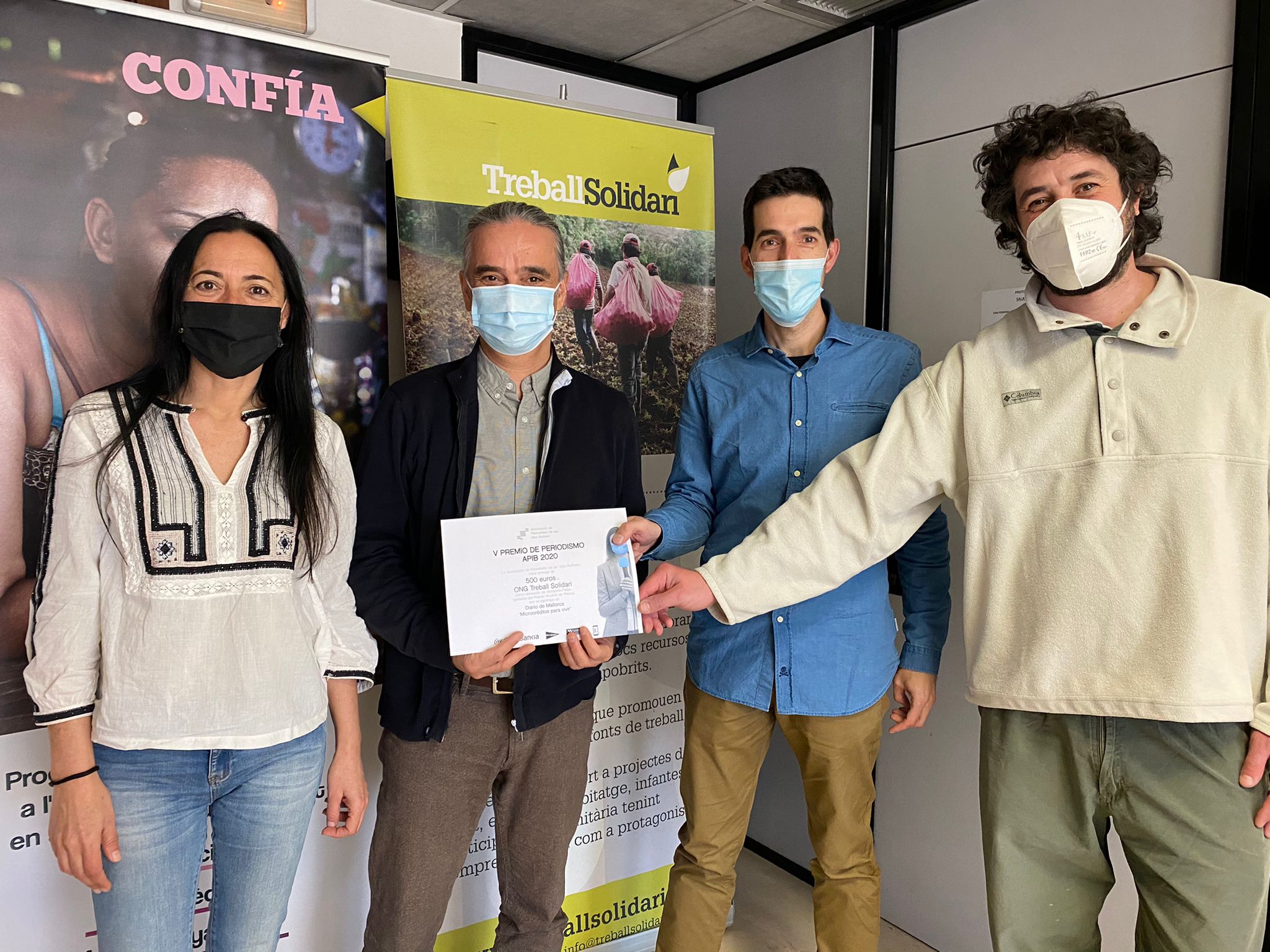 El periodista Benjamín Palau, ganador del V Premio de Periodismo APIB, y el fotógrafo Manu Mielniezuk han donado el galardón de los 500 euros del Accésit de Prensa a la ONG Treball Solidari, sobre la que versaba el artículo premiado. La presidenta de la Asociación de Periodistas de las Islas Baleares (APIB), Ángeles Durán, se reunió ayer con los autores y los responsables de la entidad solidaria en las instalaciones de la ONG para hacer efectiva la cesión económica. “Es la segunda vez que ganadores del premio de APIB donan el importe a causas solidarias. Además de buenos periodistas, en Baleares tenemos grandes compañeros solidarios”, dijo Durán.