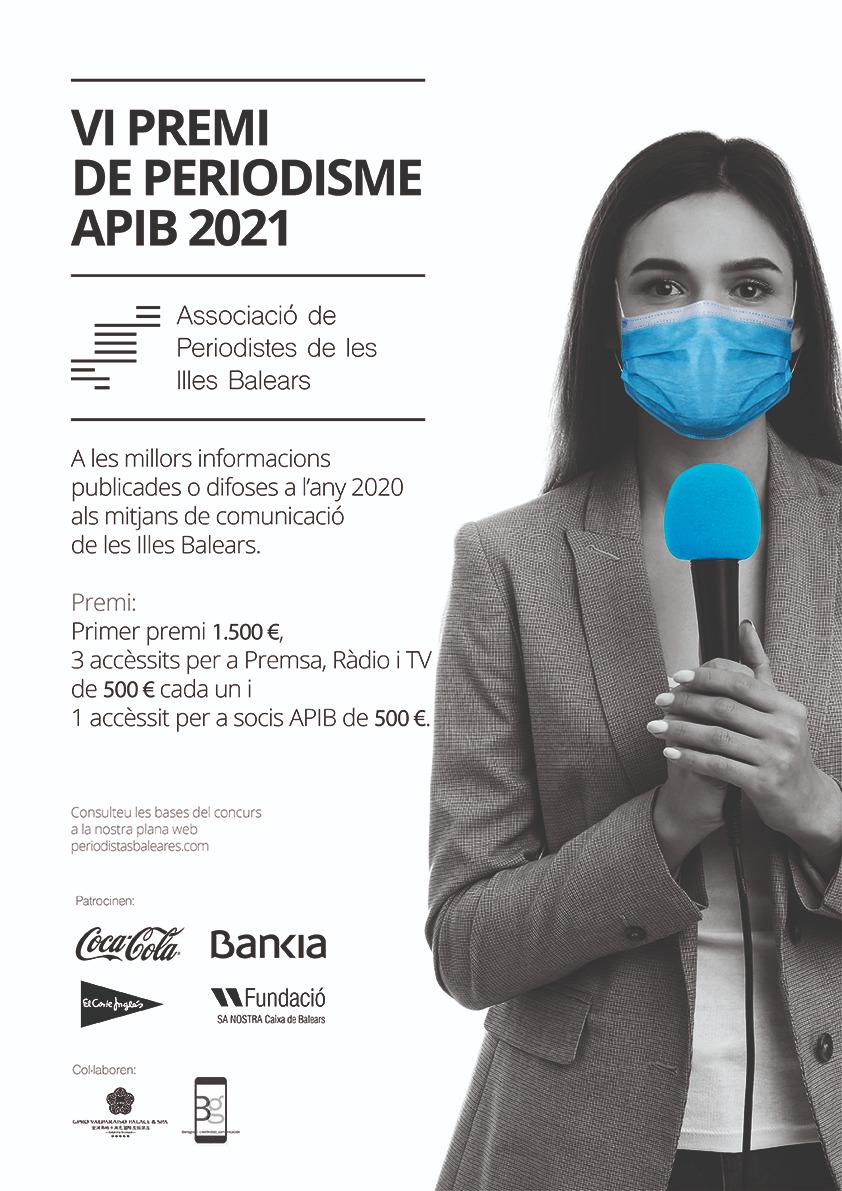 La Asociación de Periodistas de las Islas Baleares (APIB), integrada en la Federación de Asociaciones de la Prensa Española (FAPE), convoca el VI Premio de Periodismo APIB (Bases aquí), con una dotación global de 3.500 euros, repartidos en un primer premio (categoría absoluta) de 1.500 euros, tres accésit de 500 euros para prensa, radio y televisión, y una categoría especial para trabajos periodísticos de socios de APIB, también de 500 euros. El objetivo de este certamen, que celebra su sexta edición, es el fomento de un periodismo de calidad, comprometido y responsable, que ponga de manifiesto su importancia en la consolidación de la democracia y los derechos fundamentales. El concurso pretende reconocer la información elaborada por periodistas profesionales, difundida en medios de comunicación baleares. Patrocinan el certamen Coca Cola, Bankia, El Corte Inglés y Fundación Sa Nostra.