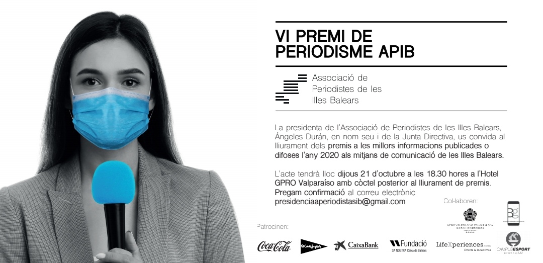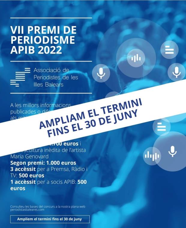 La Asociación de Periodistas de las Islas Baleares (APIB), integrada en la Federación de Asociaciones de la Prensa Española (FAPE), convoca el VII Premio de Periodismo APIB (Bases), con una dotación global que pasa de 3.500 a 5.000 euros. Los galardones se reparten en un primer premio (categoría absoluta), que pasa de 1.500 a 1.700 euros, además de una escultura inédita de la artista Maria Genovard; un segundo premio (también categoría absoluta), dotado con 1.000 euros y que se crea en esta edición; tres accésit de 500 euros para prensa, radio y televisión, y una categoría especial para trabajos periodísticos de socios de APIB, también de 500 euros. Se incluye también el coste de asociación a APIB de los ganadores que lo deseen y bonos trimestrales para las instalaciones de CampusEsport para los finalistas.