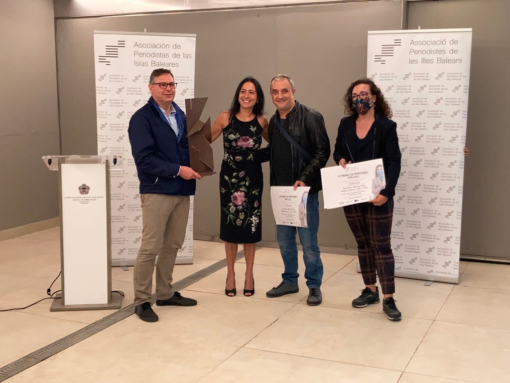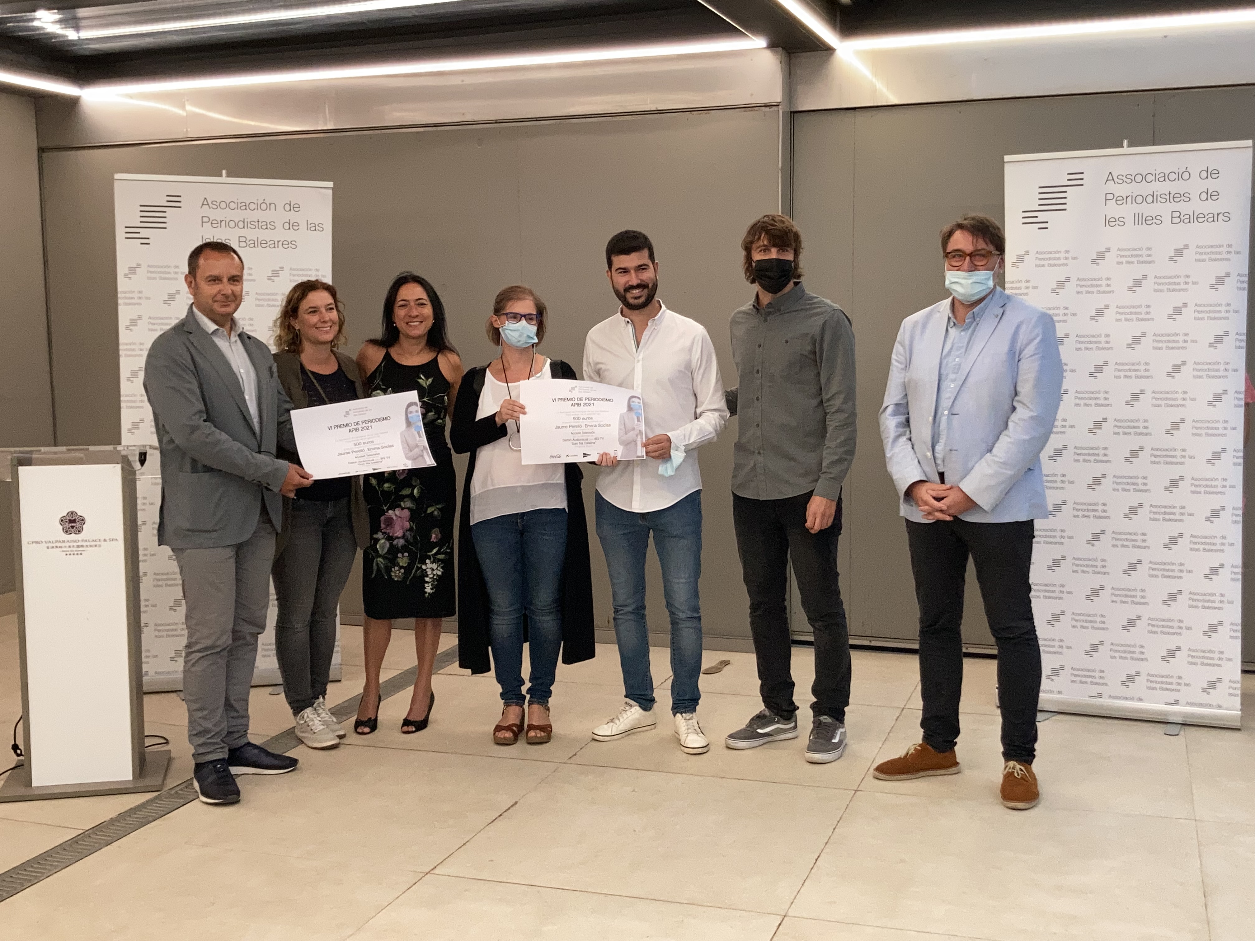 La Asociación de Periodistas de las Islas Baleares (APIB) entregó este jueves 21 de octubre de 2021, en el Hotel Valparaíso, sus VI Premios de Periodismo, a los que concurrían un total de 78 piezas periodísticas (un 47% más que en la edición anterior) y que cuenta con el patrocinio de Coca-Cola, CaixaBank, Fundació Sa Nostra y El Corte Inglés. La organización ha decidido como medida excepcional, a partir del fallo del jurado, deshacer un empate concediendo dos primeros premios, Categoría Absoluta, dotándolos con 1.000 euros cada uno y con sendas esculturas inéditas de la artista Maria Genovard, a Noemi Martínez, por su reportaje ‘Los sonidos de la UCI’, de SER Ibiza, sobre los ingresos durante la pandemia, y a Xavi Peris, Marcos Ollés, Miquel Adrover y Àlex Cortès, de Diario de Mallorca, por una serie de 75 piezas sobre prostitución y abusos a menores tuteladas. La consellera Presidència, Mercedes Garrido, y la primera tinent de batle del Ajuntament de Palma y concejal de Seguretat Ciudadana, Joana Mª Adrover, han entregado los galardones, respectivamente.