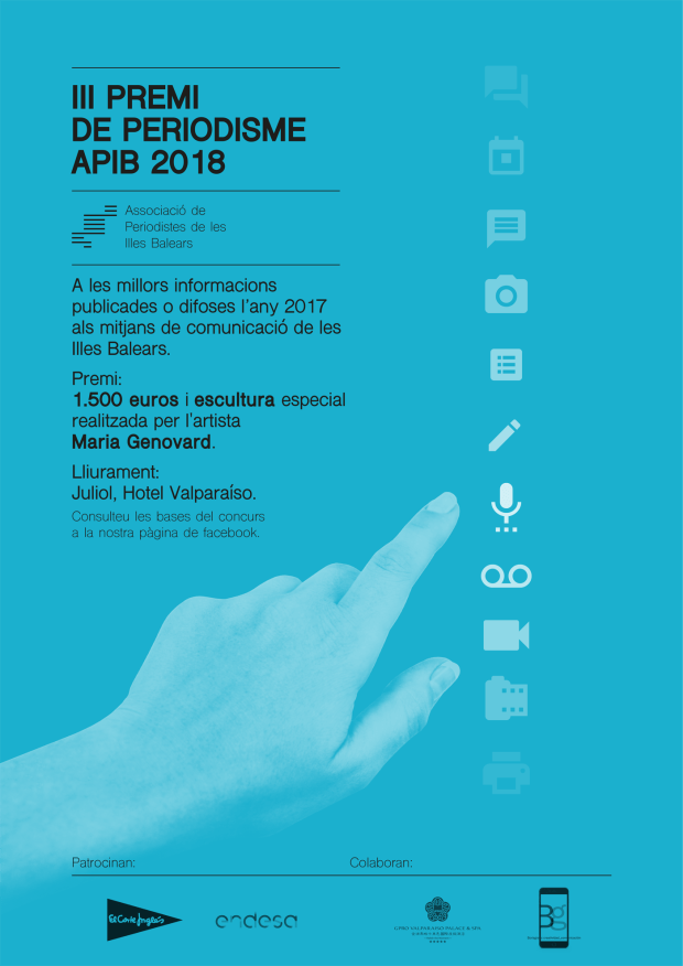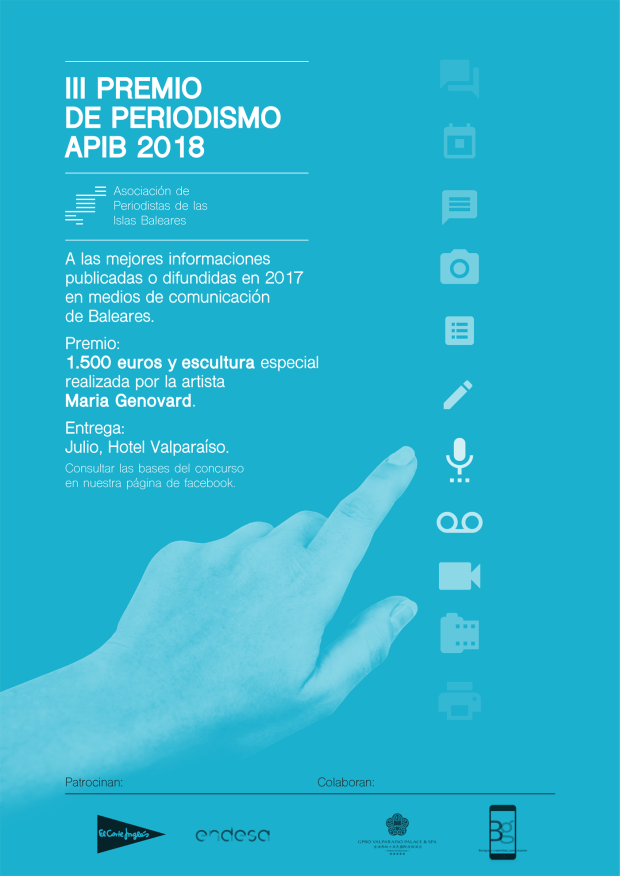 La Asociación de Periodistas de las Islas Baleares (APIB), integrada en la Federación de Asociaciones de la Prensa Española (FAPE), convoca el III Premio de Periodismo APIB, cuyo objetivo es el fomento de un periodismo de calidad, comprometido y responsable, que ponga de manifiesto su importancia en la consolidación de la democracia y los derechos fundamentales. El certamen pretende reconocer la información elaborada por periodistas profesionales, difundida en medios de comunicación baleares. El autor o autores del trabajo seleccionado recibirán un premio único de 1.500 euros y una escultura especial realizada por la artista María Genovard. Patrocinan el certamen El Corte Inglés y Endesa. Los trabajos deben entregarse antes del domingo 17 de junio de 2018 en el correo presidenciaaperiodistasib@gmail.com.