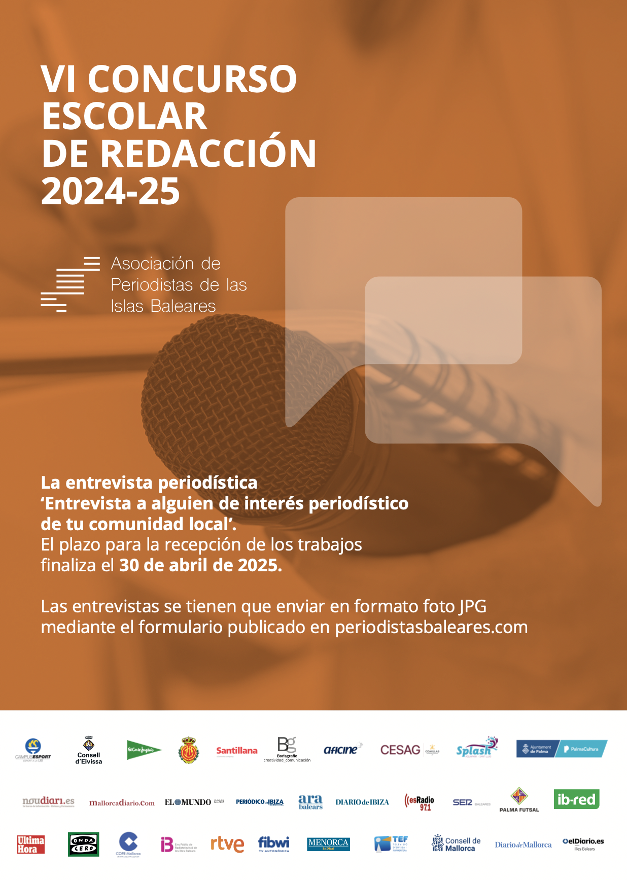 La Asociación de Periodistas de las Islas Baleares (APIB), integrada en la Federación de Asociaciones de la Prensa Española (FAPE), convoca el VI Concurso de Redacción Escolar sobre periodismo APIB, cuyo objetivo es dar a conocer la importancia del periodismo en el ámbito educativo, trasladar la importancia de un periodismo riguroso y fomentar un consumo crítico de noticias. El reto de esta edición es que los alumnos conozcan y practiquen el formato de la entrevista periodística.