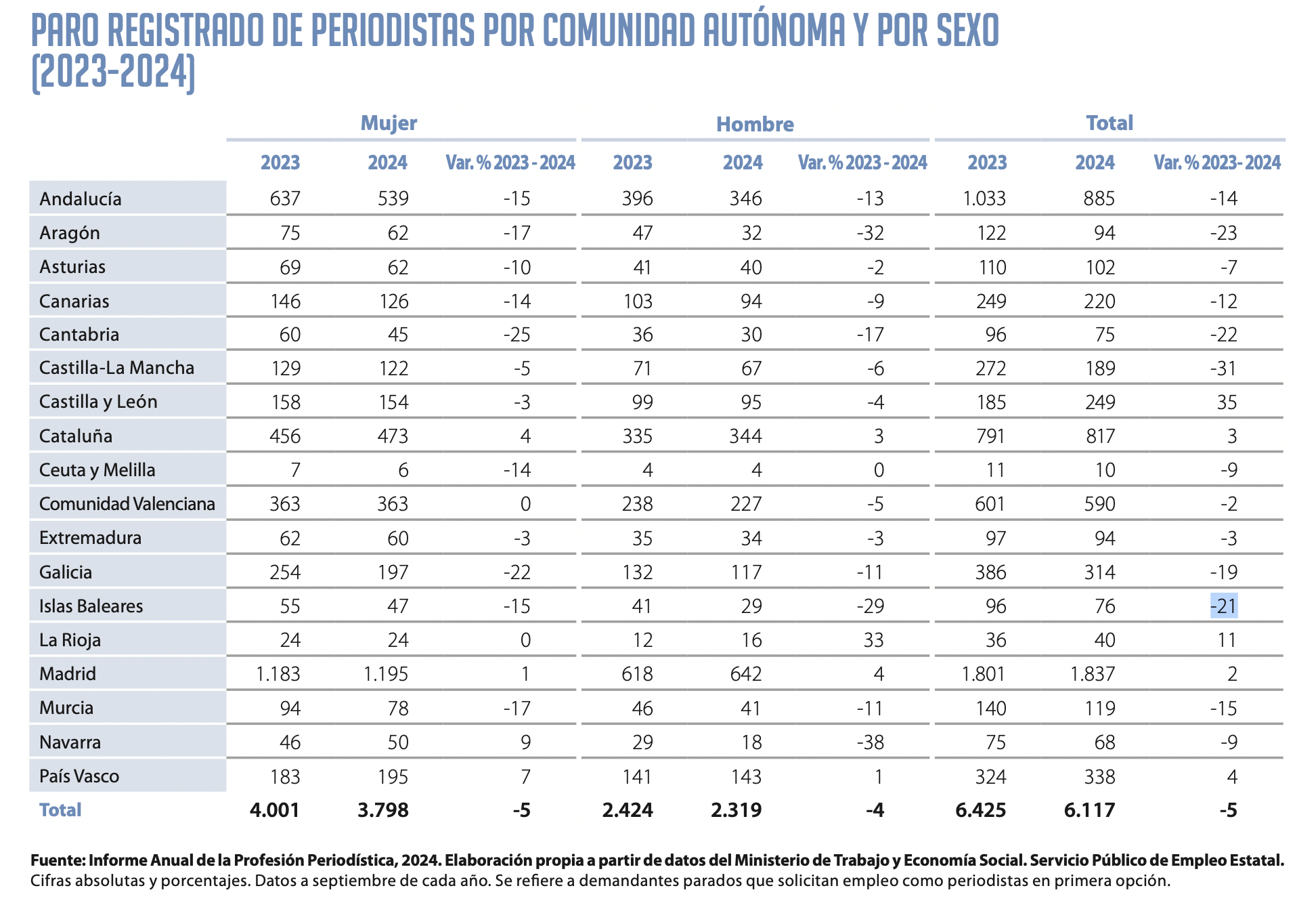 Baleares cerró 2024 con 76 periodistas en paro, un 21% menos que el año anterior (había 96). Según el Servicio de Empleo Público Estatal (SEPE), el desempleo en Baleares ha bajado y se coloca en el nivel más bajo de la última década. En el resto del país el paro también ha bajado, pero en menor medida: un 5% de media. El dato aparece publicado el Informe de la Profesión Periodística 2024 que realiza cada año la Asociación de la Prensa de Madrid (APM).